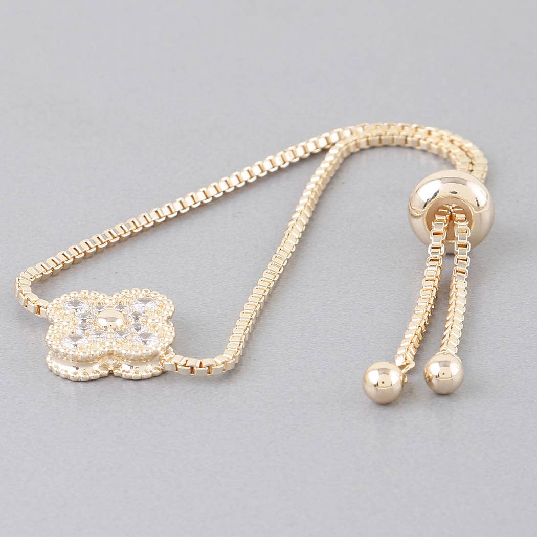 Bejeweled Clover Box Chain Bracelet, 2.4 x 2.4" Approx., CZ, Introducing the "Bejeweled Clover Box Chain Bracelet" – a stunning piece that combines the beauty of nature with luxurious design. Featuring a delicate flower motif and a sparkling rhinestone clasp, this bracelet is perfect for those who appreciate the finer things in life.