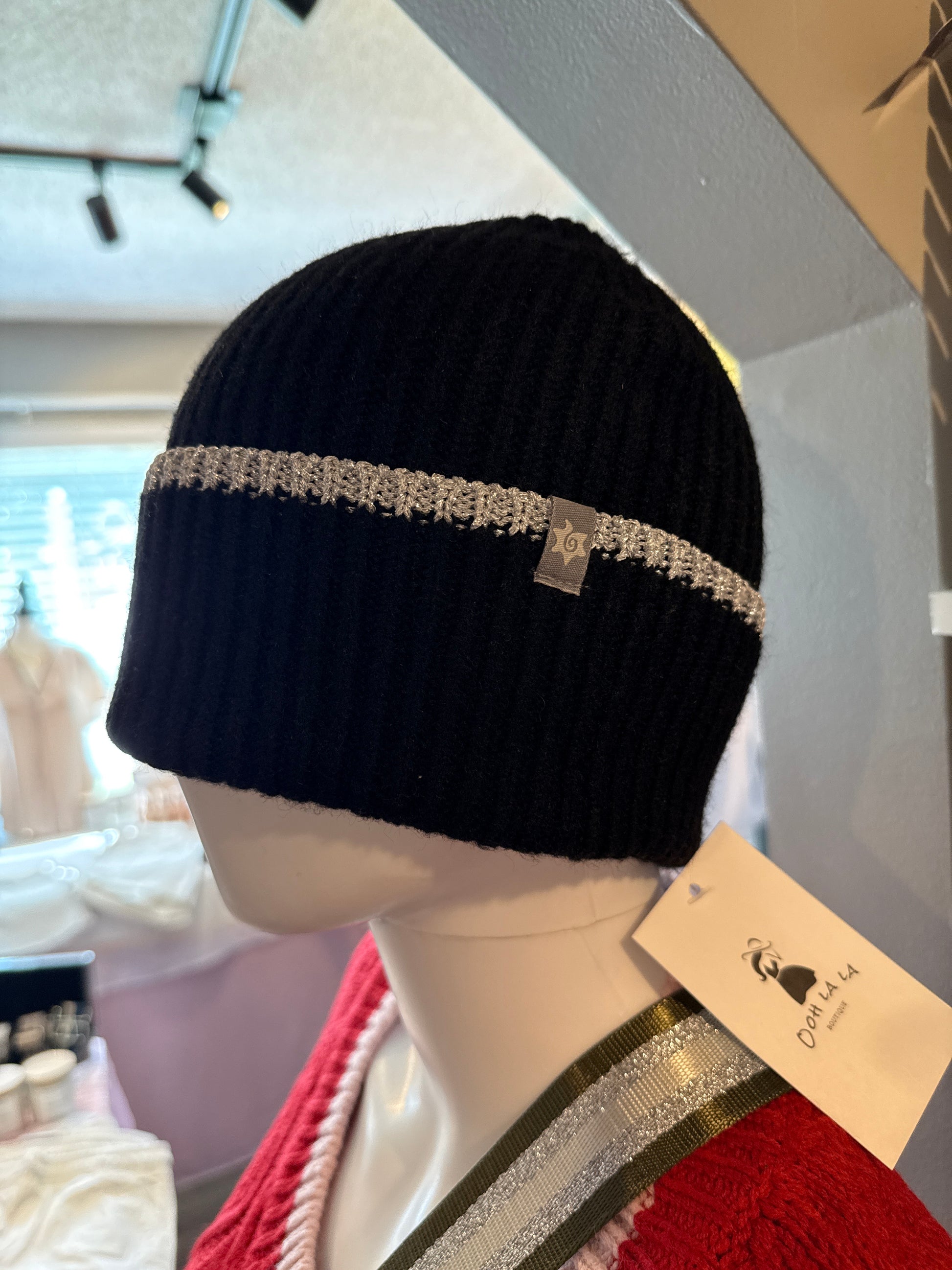 Black Ribbed with a silver Strip One Size. 42% Acrylic, 28% Polyamide, 30% PBT